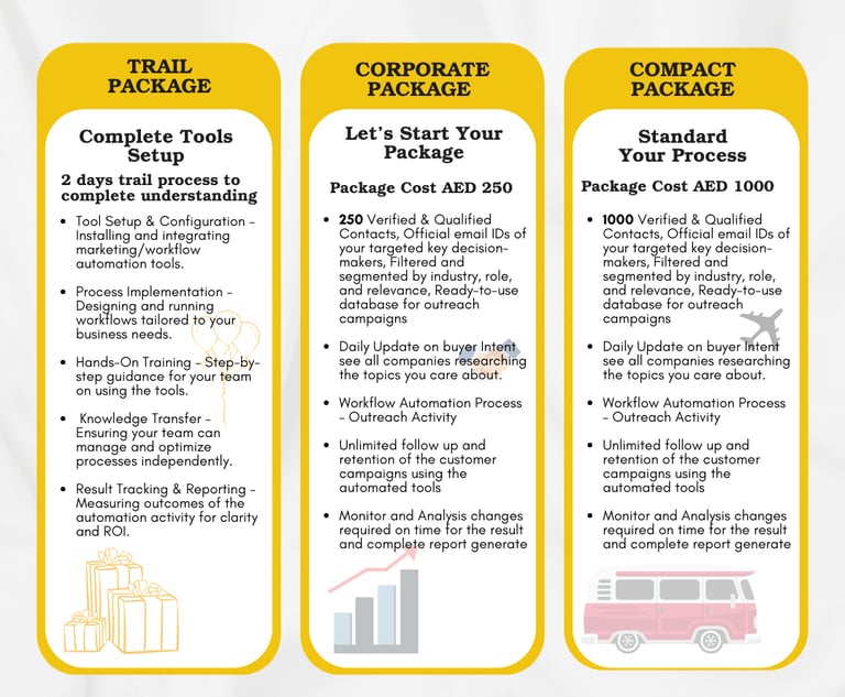 5. What is a Trial Package? - Our Trial Package is a short-term engagement (2– days) where we: Set up workflow automation tools, Run a pilot outreach campaign, Segment up to 1,000 leads, Provide a performance report with actionable insights, It allows clients to test automation and outreach effectiveness